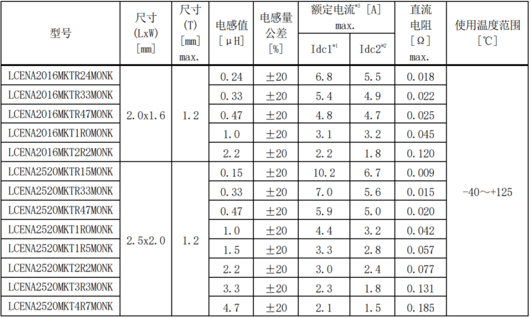 *1 額定電流(Idc1)是負載直流電流時的電感變化率在 30%以內的電流值(at 20℃)